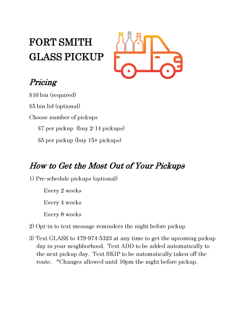 June 2025 update: There is new residential pricing available! This is less expensive for about 90% of our residential customers. The old pricing was based on the number of months of glass recycling service. The new pricing is based on the number of pickups you use. Use our automated text-based request system, and you will never pay for a pickup you don’t need.